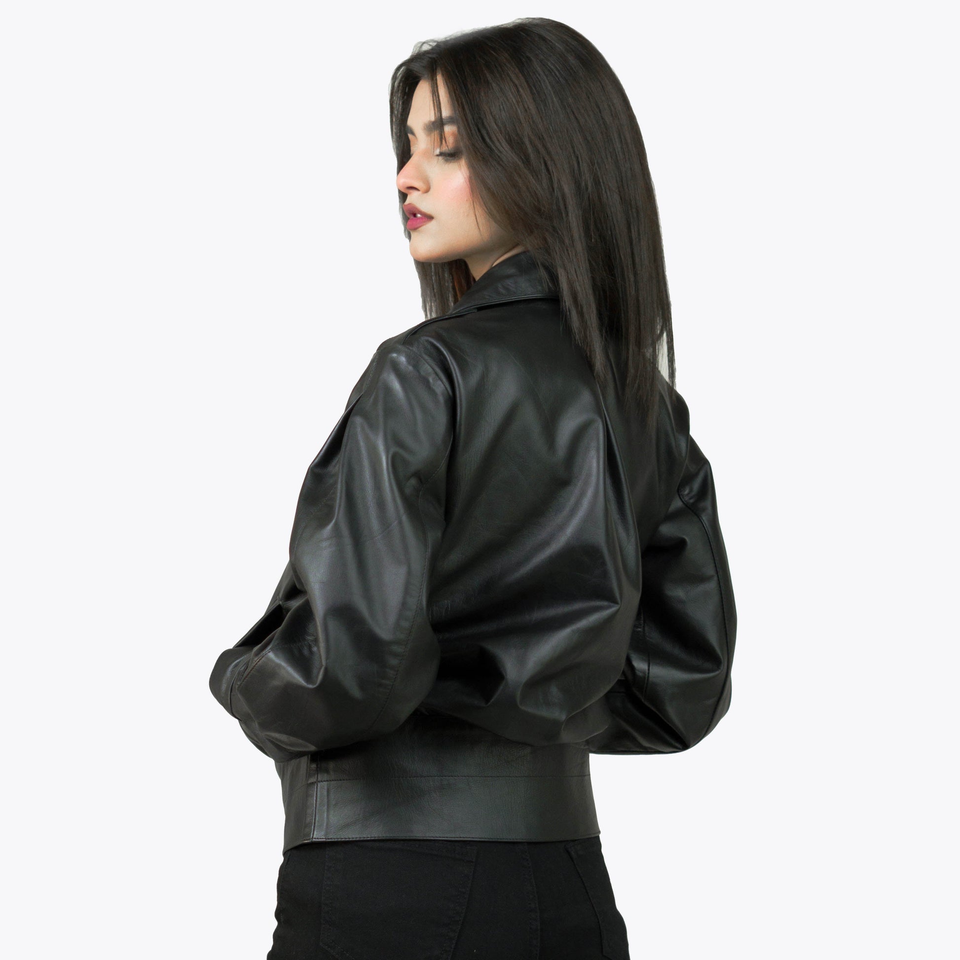 Black Biker Leather Jacket w/ Notch Collar - Lèa