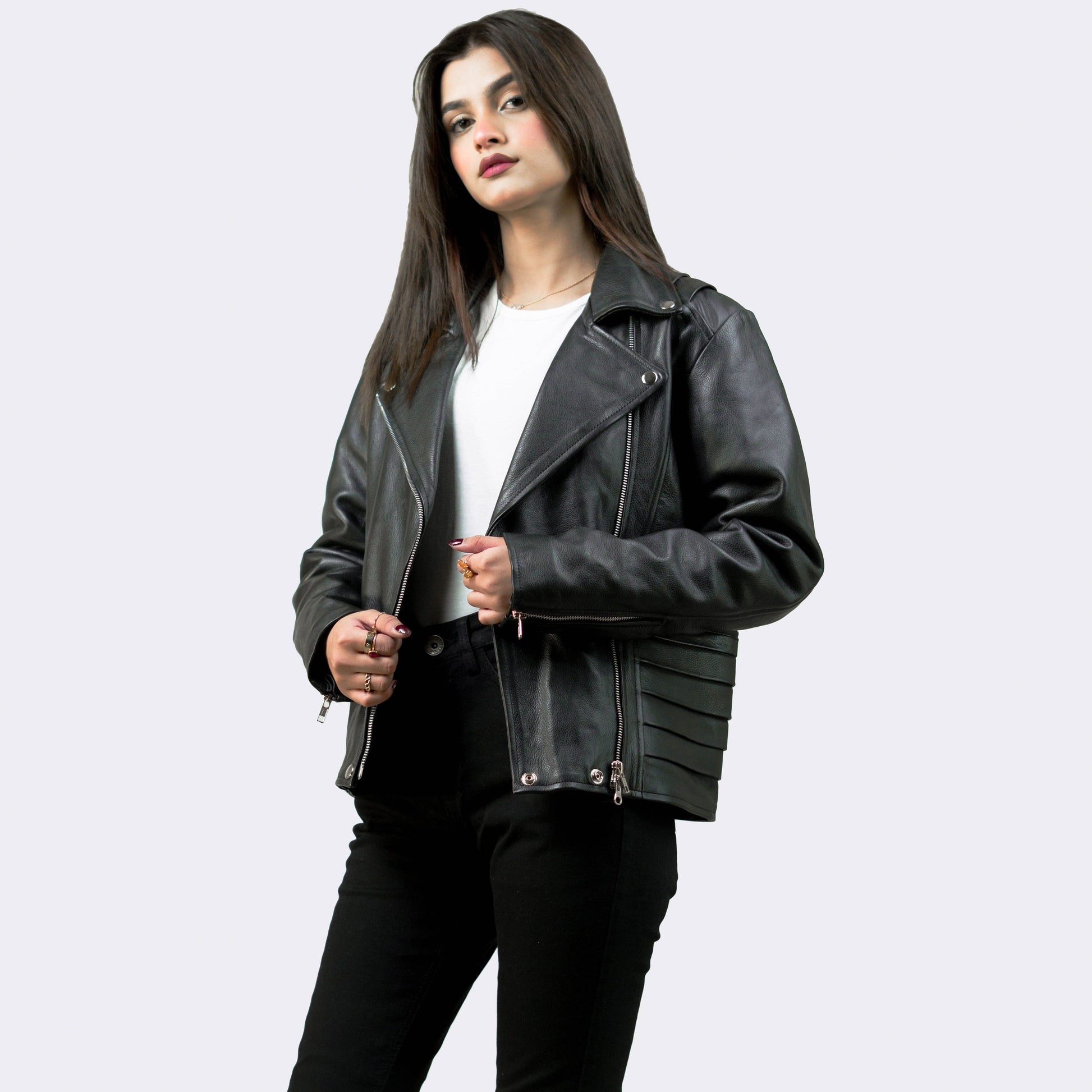 Black Leather Biker Jacket w/ Notch Collar - Aida
