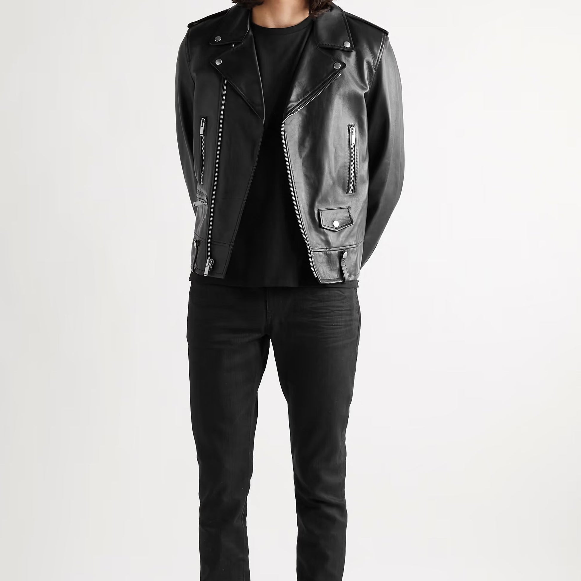 Black Biker Leather Jacket w/ Notch Collar - Gensa
